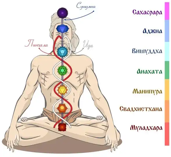 Теперь посмотрите, как ида и пингала движутся по позвоночнику. Они периодически перекрещиваются и уже в самом конце выходят таким образом, что одна завершается в одной ноздре, другая - в другой, а между ними всегда - сушумна. В момент пересечения, как бы перехода на противоположную сторону, ида и пингала соединяются с сушумной. Это очень интересные места в организме человека. Кто хочет добиваться духовных, или физических, или физиологических интересностей, могут обратить очень серьёзное внимание именно на эти места. Они анатомически детерминированы. Туда можно поставить иголку, туда можно поставить пиявку, какое-нибудь раздражающее вибрационное начало, и вы получите очень серьезный терапевтический (в случае болезни), духовный, а то и сверх-духовный эффект.
